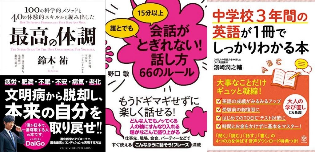 Kindleストアでは11月3日の日替わりセールとして、鈴木祐(著)『最高の体調 ACTIVE HEALTH』599円、野口敏(著)『誰とでも15分以上 会話がとぎれない!話し方66のルール 』299円(80%OFF)、濱崎潤之輔(著)『中学校3年間の英語が1冊でしっかりわかる本』599円(50%OFF)の3冊が販売されています。