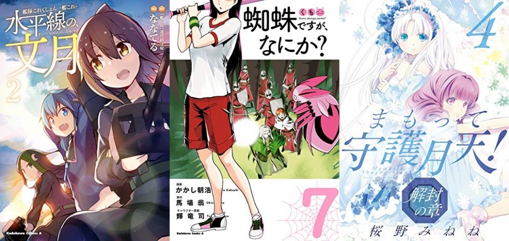 本日はコミックに「蜘蛛ですが、なにか?(7)」「艦隊これくしょん ‐艦これ‐ 水平線の、文月(2)」「まもって守護月天! 解封の章 4巻」「艦隊これくしょん -艦これ- 今宵もサルーテ!(1)」などが、小説に「蜘蛛ですが、なにか? 11」「世界最強の後衛 ~迷宮国の新人探索者~ 5」などが登場しています。